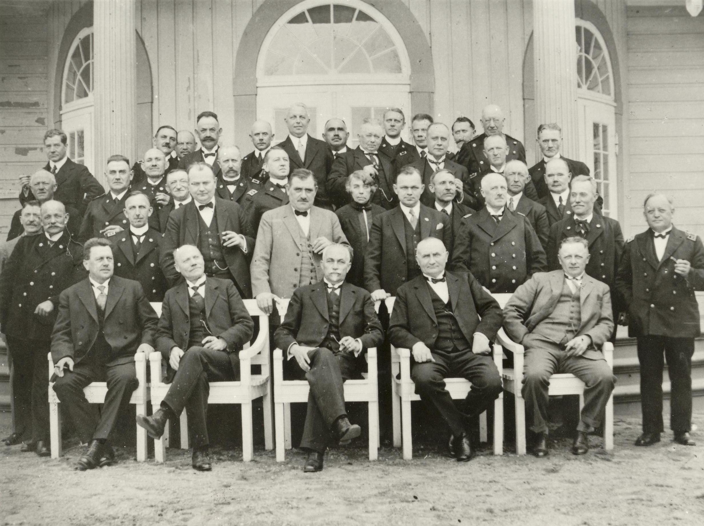 Nej, dette er ikke modelbaneklubbens bestyrelse, men personale fra virkelighedens bane samlet til 25 års jubilæum på Aldershvile Slotspavillon i 1931. Forrest i midten sidder Slangerupbanens bestyrelsesformand, F. Nielsen-Kolding. Bag ham står driftsbestyrer L. J. Bager og ved siden af ham ekspreditrice Marie Christensen fra Hareskov Station - som eneste kvinde...